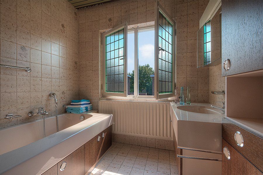 Betegelde badkamer ca. 2.40×2.11 met ligbad en wastafelmeubel.