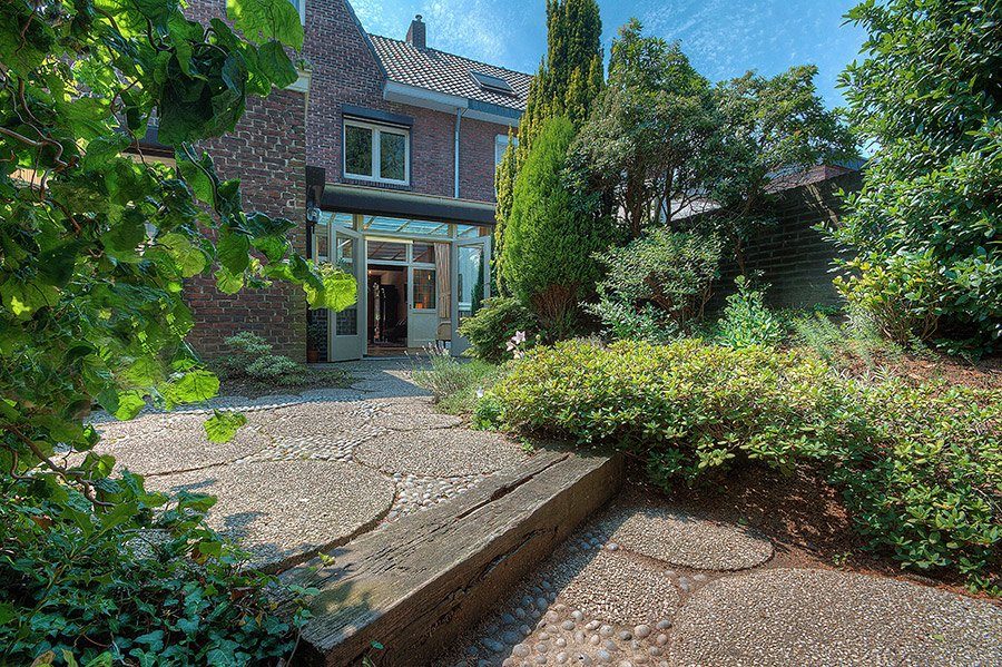 Omsloten siertuin met optimale privacy, zonneterras en afgesloten zij-uitgang naar de grote inrit t.b.v. meerdere auto’s