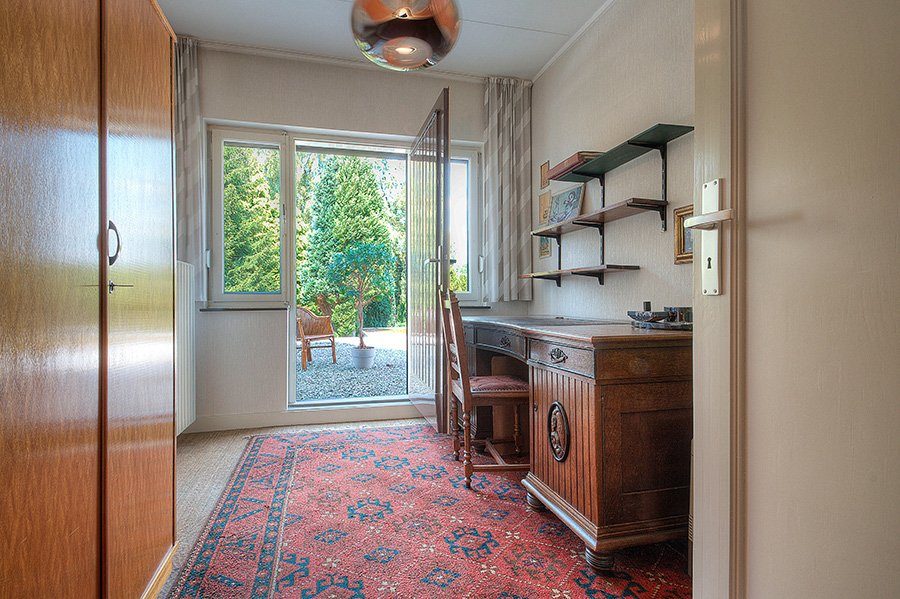 De serre is middels schuifdeuren met glas-in-lood glas afsluitbaar van de woonkamer.