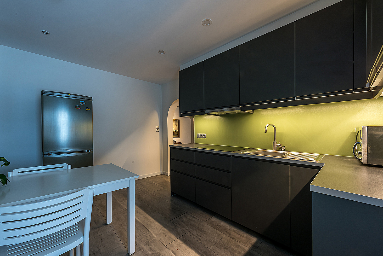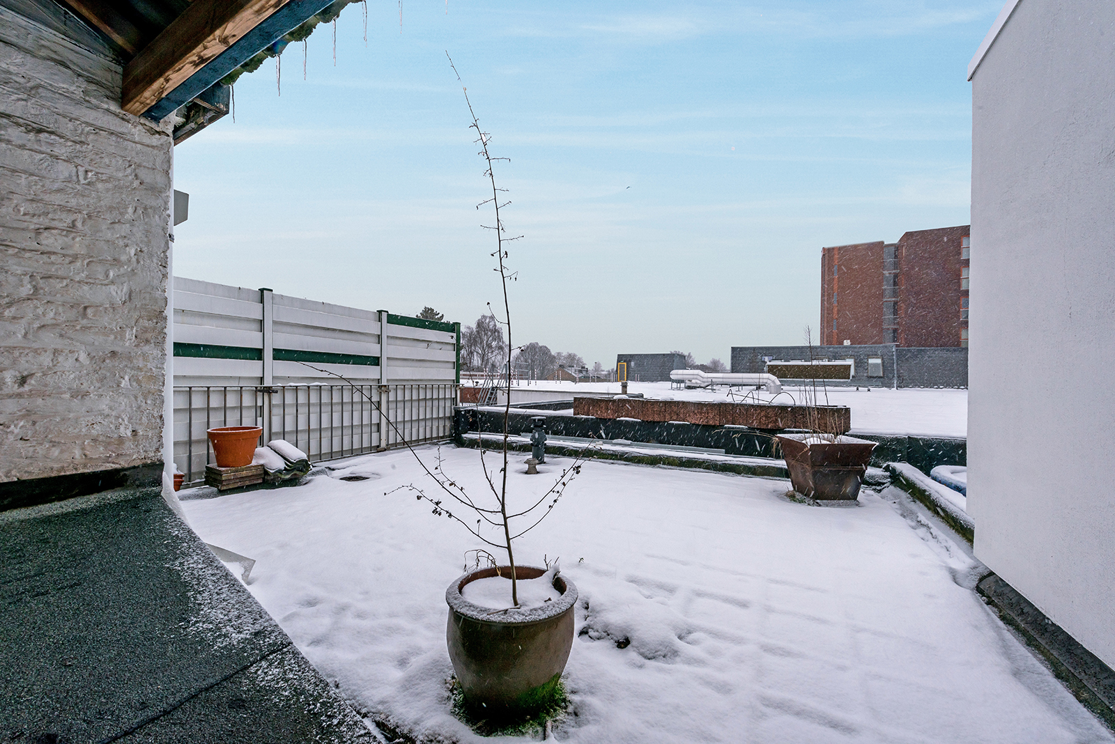 Gesloten keuken ca 4.00 x 3.00 met moderne aanbouwkeuken in hoekopstelling vv. inductie kookplaat, afzuigkap en vaatwasser. Vanuit de keuken toegang tot een dakterras.