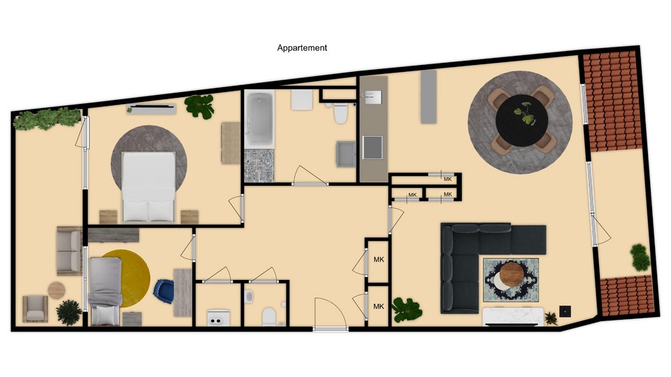 Het appartement beschikt over 2 slaapkamers resp. ca. 3.60 x 3.60 en 2.70 x 2.40.