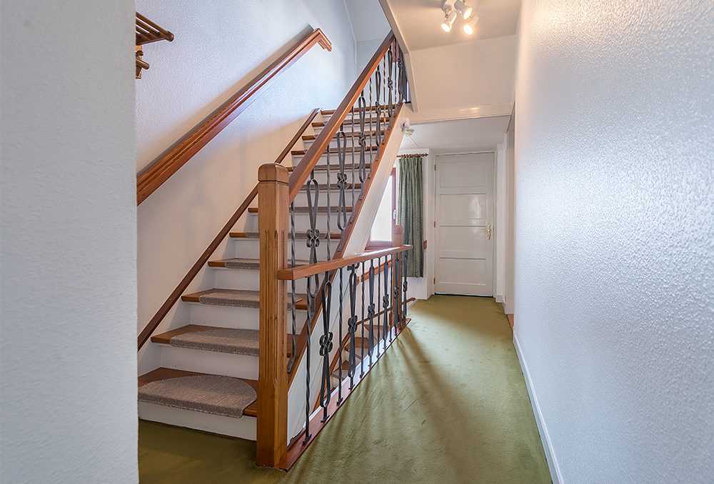 Entree, ruime hal met leistenen vloer, meterkast, gastentoilet en trap naar de verdieping.