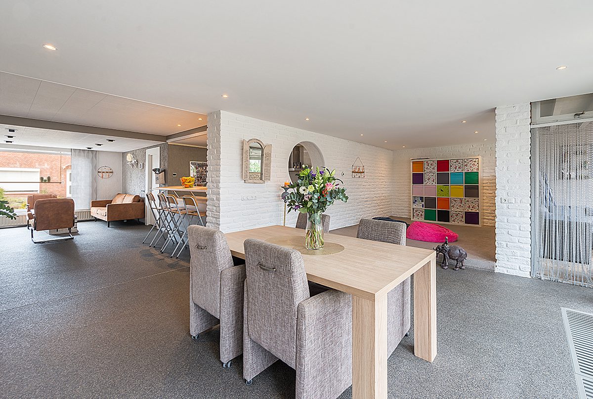 Woonkamer ca. 7.20 x 3.60 met grindvloer en aansluitend grote aanbouw ca. 9.00 x 5.00/3.50.