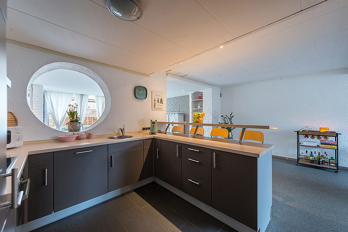 Keuken ca. 3.10 x 2.30 met tegelvloer, moderne aanbouwkeuken v.v. inductie kookplaat, oven, afzuigkap, koelkast, diepvries en vaatwasser.