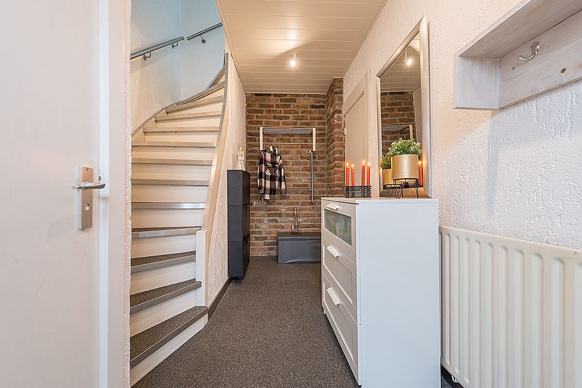 Entree/hal met grindvloer, meterkast en gastentoilet met hangtoilet en fonteintje en trap naar de verdieping.