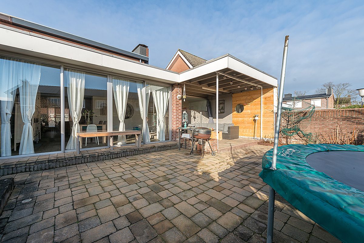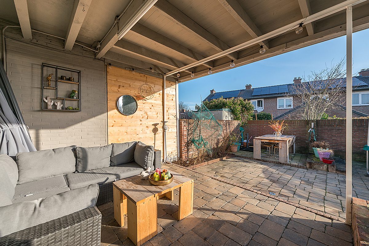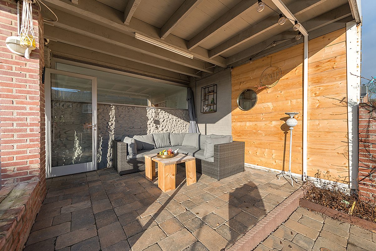 Schuifpui naar de tuin met overdekt terras en onderhoudsvrije siertuin.