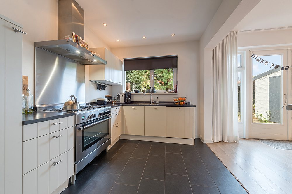 Open keuken ca 3.50 x 2.85 met moderne aanbouwkeuken in hoekopstelling v.v. 5-pits gascomfort, oven, afzuigkap, koelkast en vaatwasser.
