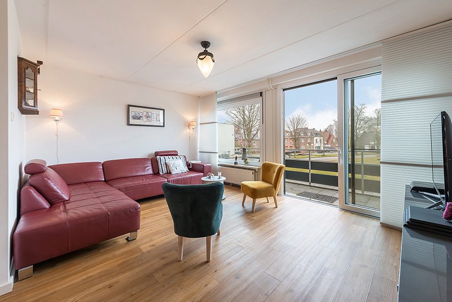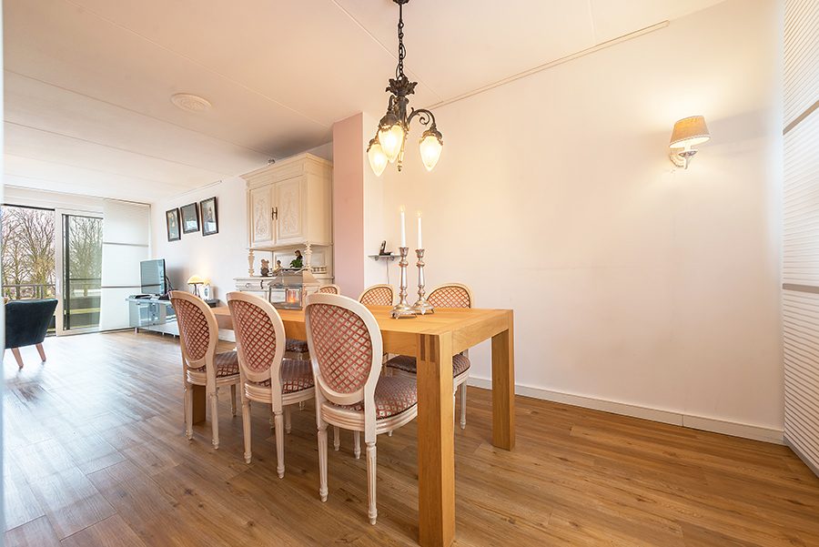 L-living ca. 9.50 x 4.60/2.60 met schuifpui naar het betegelde balkon, open keuken met aanbouwkeuken v.v. gascomfort, combi-oven, afzuigkap, koelkast en vaatwasser.