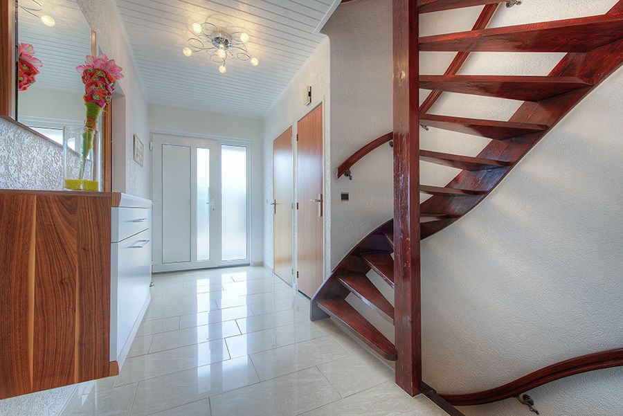 Vast trap naar overloop met parketvloer, cv-berging ter linkerzijde met (huur) cv-combiketel en bergkast aan rechterzijde.