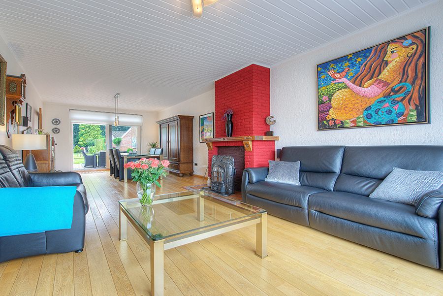 Doorzonwoonkamer ca. 9.00 x 3.80 met parketvloer, schuifpui naar de tuin en haardpartij met hout/kolen kachel.