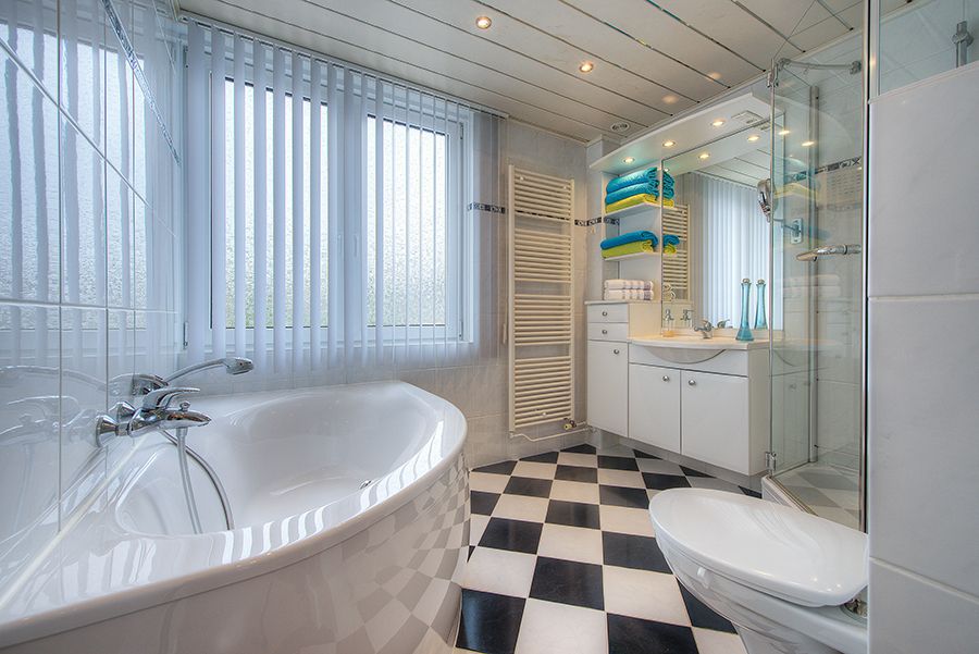 Badkamer met ligbad, douche, toilet, wastafelmeubel en designradiator ca. 2.70 x 2.40.