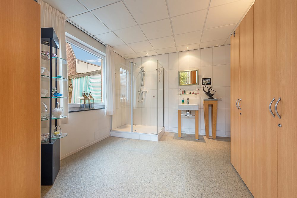 Ruime badkamer ca. 3.50 x 3.00 met inloopdouche, wastafel en