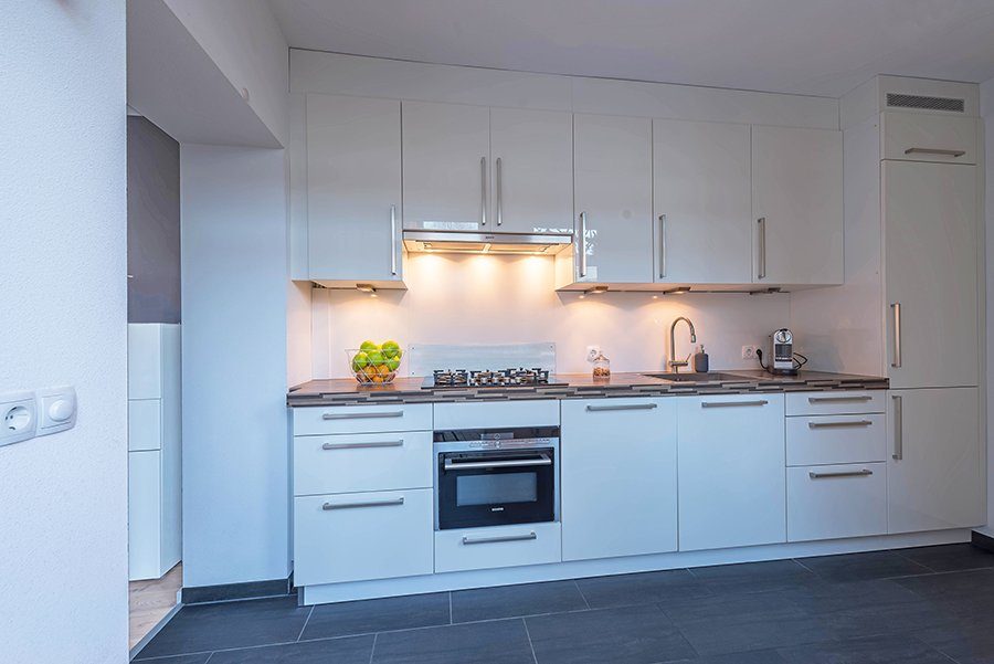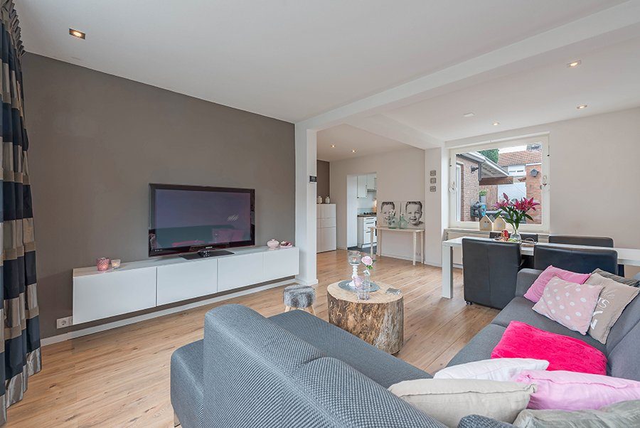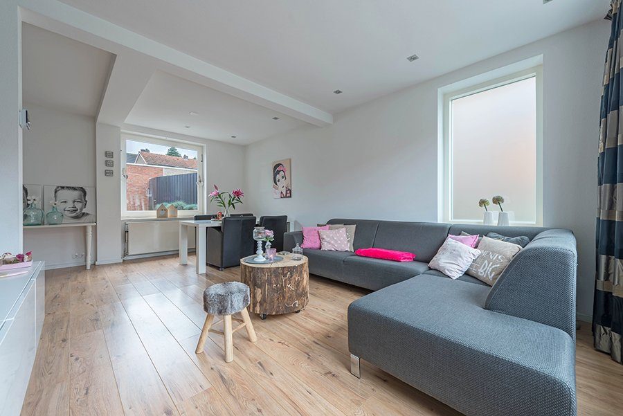 L-woonkamer ca. 6.00 x 5.66/3.00 met laminaatvloer. Gesloten keuken ca 3.50 x 1.70 met moderne designkeuken v.v. 5-pits gascomfort, oven, rvs afzuigkap, koelkast, diepvries en vaatwasser.