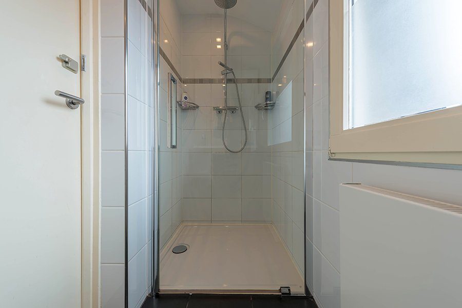 Overloop, drie slaapkamers resp. ca. 4.05 x 2.62, 3.85 x 2.20 en 3.00 x 2.95 alle voorzien van een laminaatvloer. Geheel betegelde badkamer met inloopdouche en wastafelmeubel.