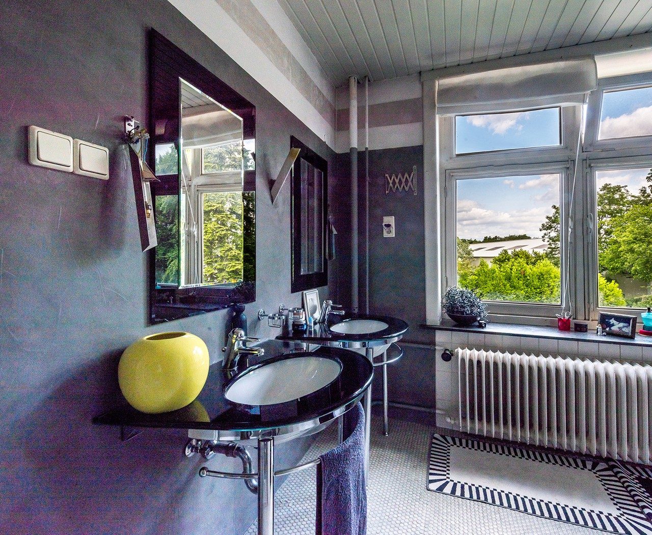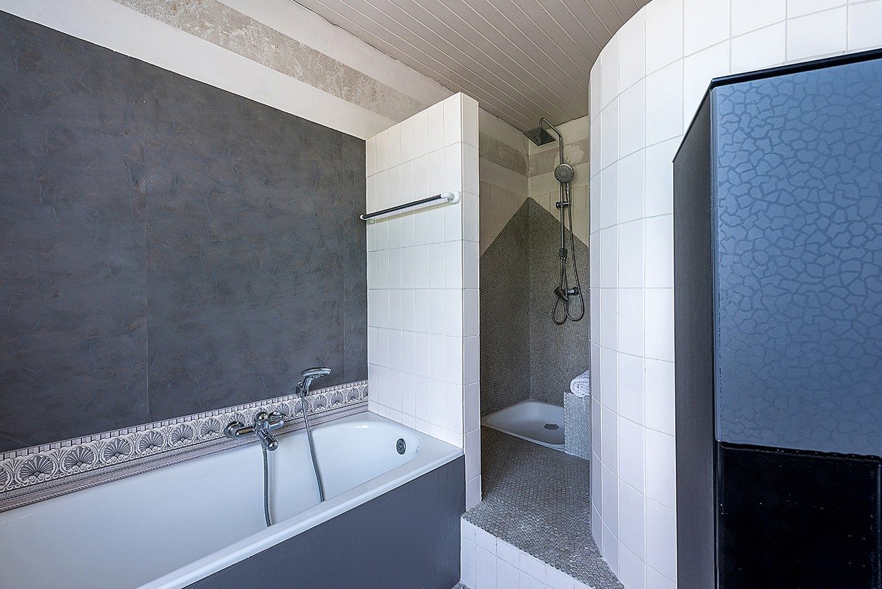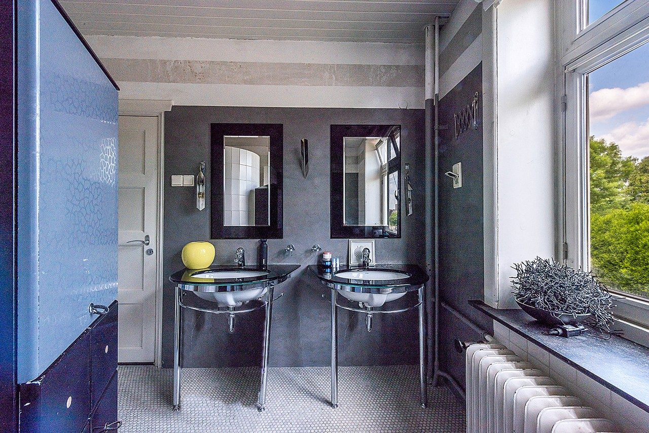 Badkamer ca. 3.35 x 3.30 met ligbad, inloopdouche, dubbel wastafelmeubel en 2e toilet.