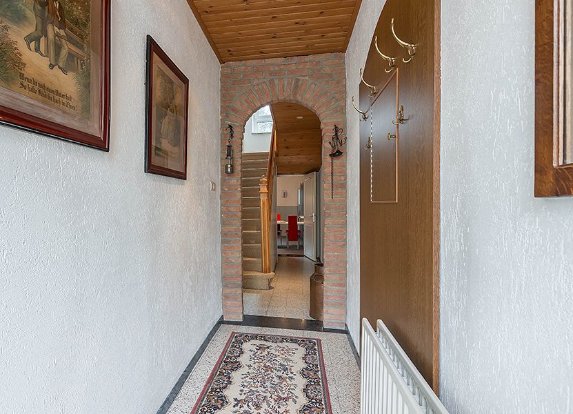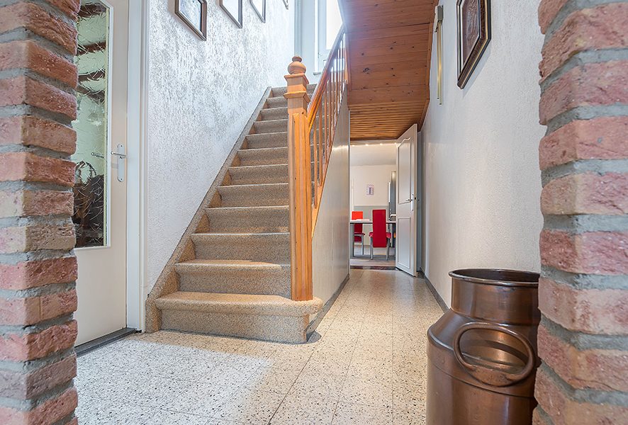Entree/hal met tegelvloer, meterkast en trap naar de verdieping.