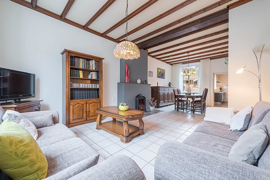 Woonkamer ca. 8.50×4.00 met tegelvloer (vloerverwarming) en schouw.