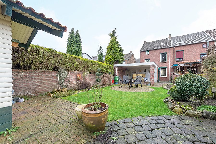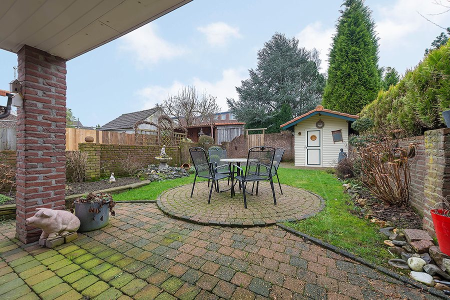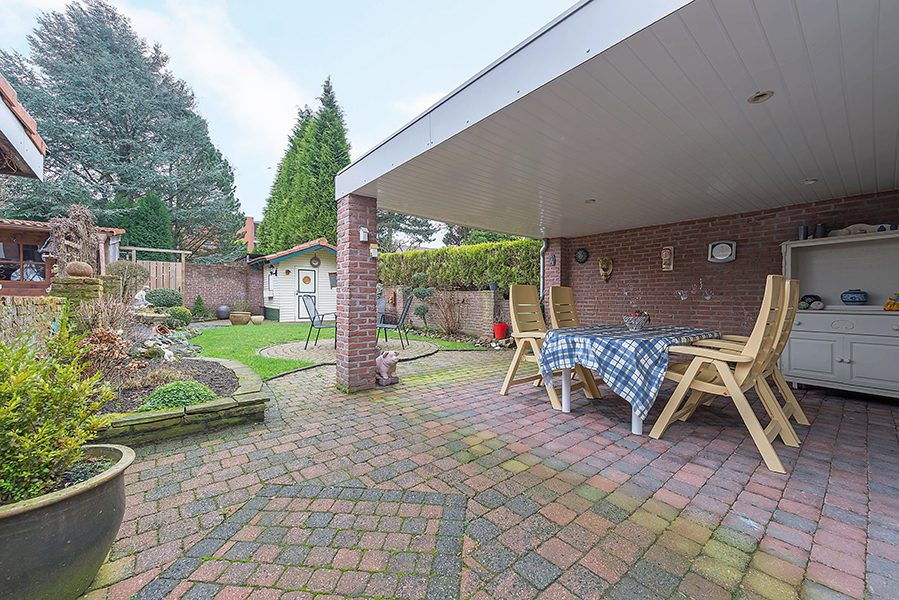 Terras met aansluitend siertuin met overdekt zonneterras en schuurtje.