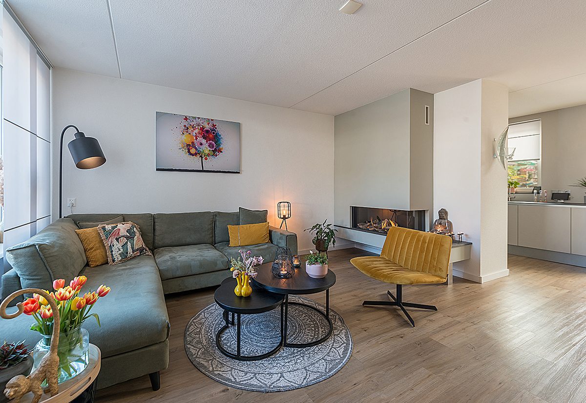 Living ca. 7.70 x 5.46/4.40 met pvc vloer, strakke gashaard en muurkast onder de trap.