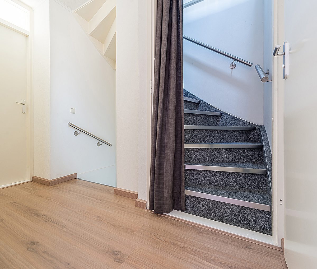 De trappen naar de 1e en 2e etage zijn bekleed met grindtreden en afgewerkt met rvs stootprofielen en trapleuning.