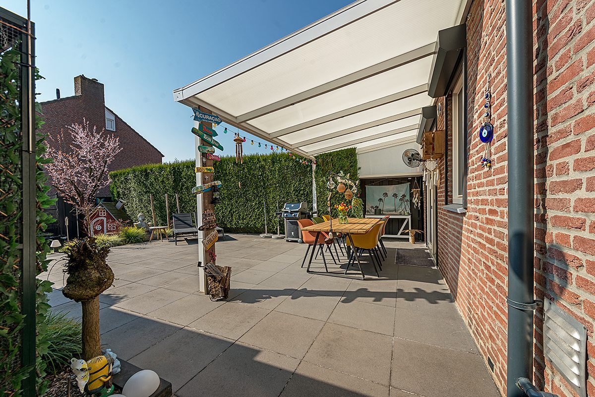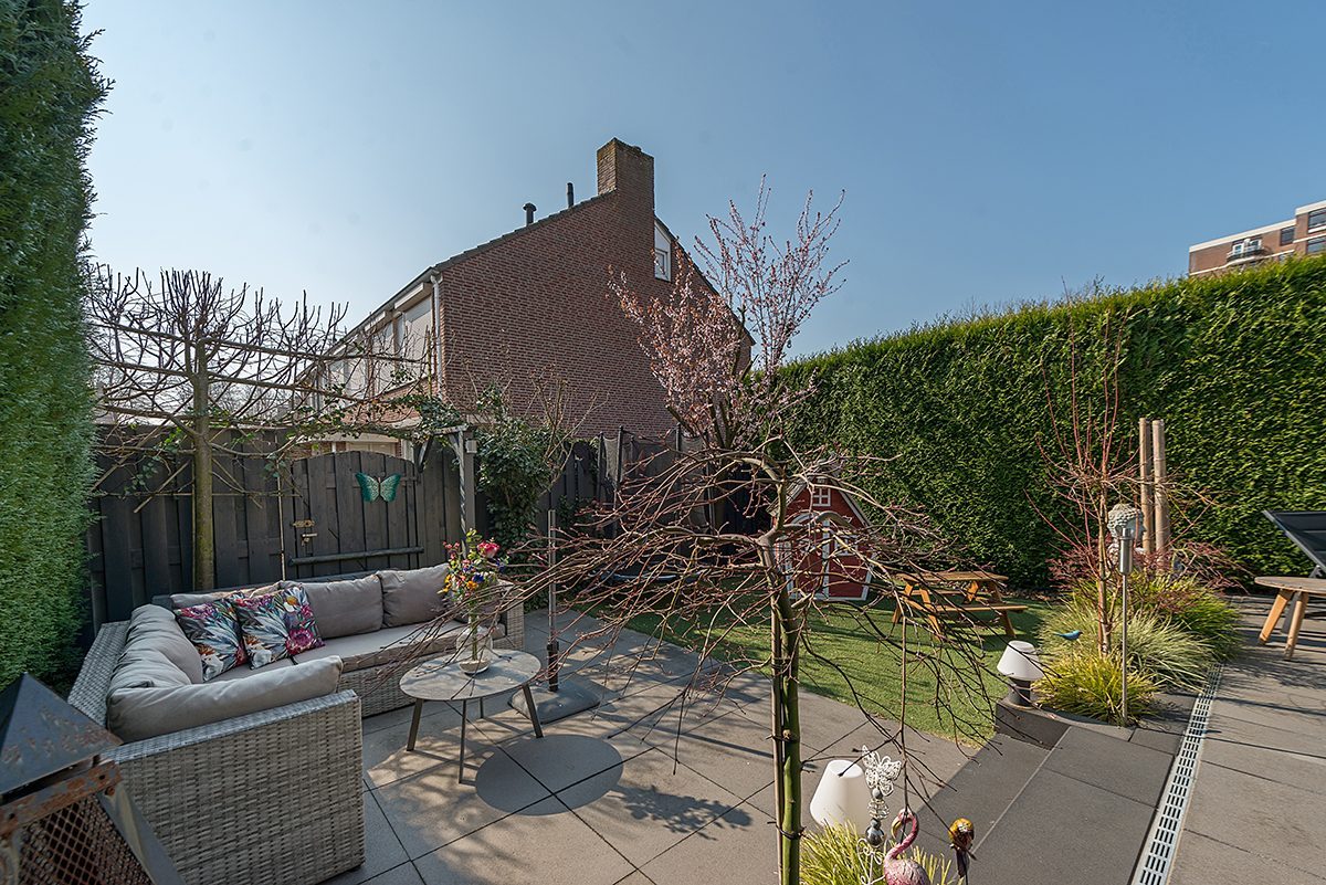 Omsloten en in 2017 geheel vernieuwde siertuin met strakke bestrating, beplanting en optimale bezonning (op Zuiden gelegen). Het overdekte zonneterras is v.v. inbouwverlichting.