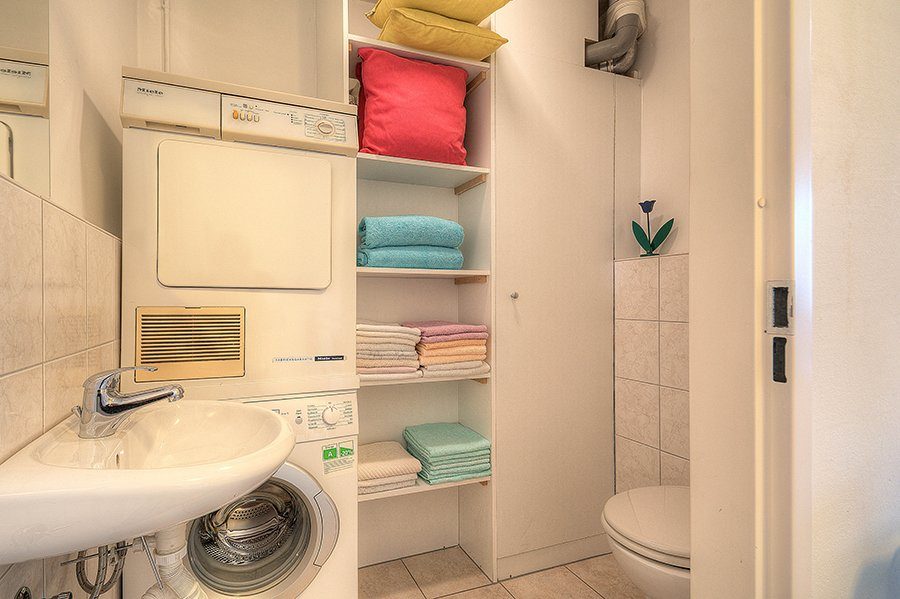 Wasruimte met een (huur) cv-combiketel, aansluiting wasautomaat en sanitact toilet.
