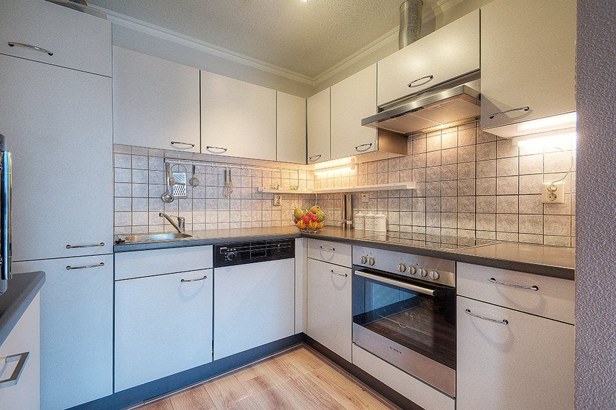 Open keuken met laminaatvloer, aanbouwkeuken v.v. keramische kookplaat, afzuigkap, oven, koelkast en vaatwasser.