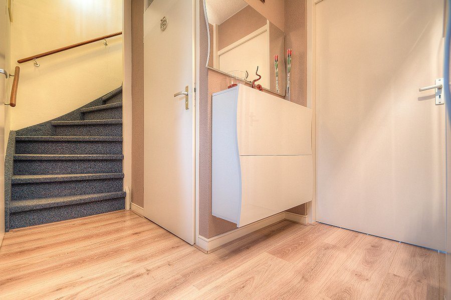 Entree/hal met laminaatvloer, gastentoilet en trap naar de verdieping.