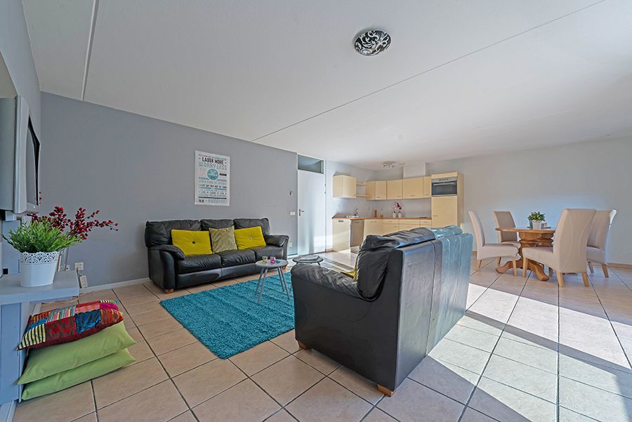 Woonkamer ca. 7.50×5.35 met tegelvloer en schuifpui naar de tuin.