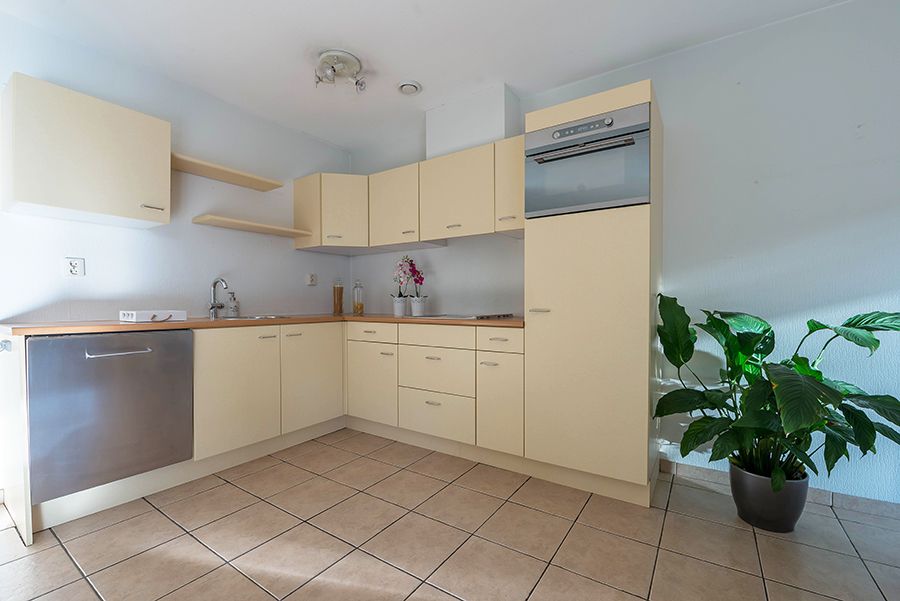 Open keuken met aanbouwkeuken v.v. keramische kookplaat, oven, afzuigkap, koelkast, magnetron en vaatwasser.