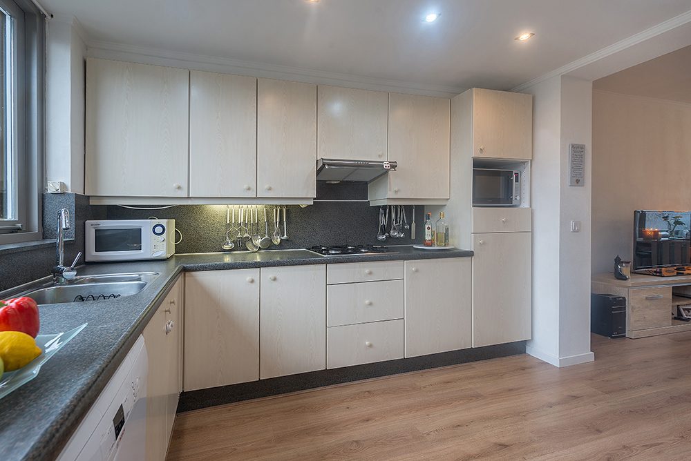 Open keuken ca. 10 m2 met aanbouwkeuken v.v. gascomfort, oven, koelkast en vaatwasser.