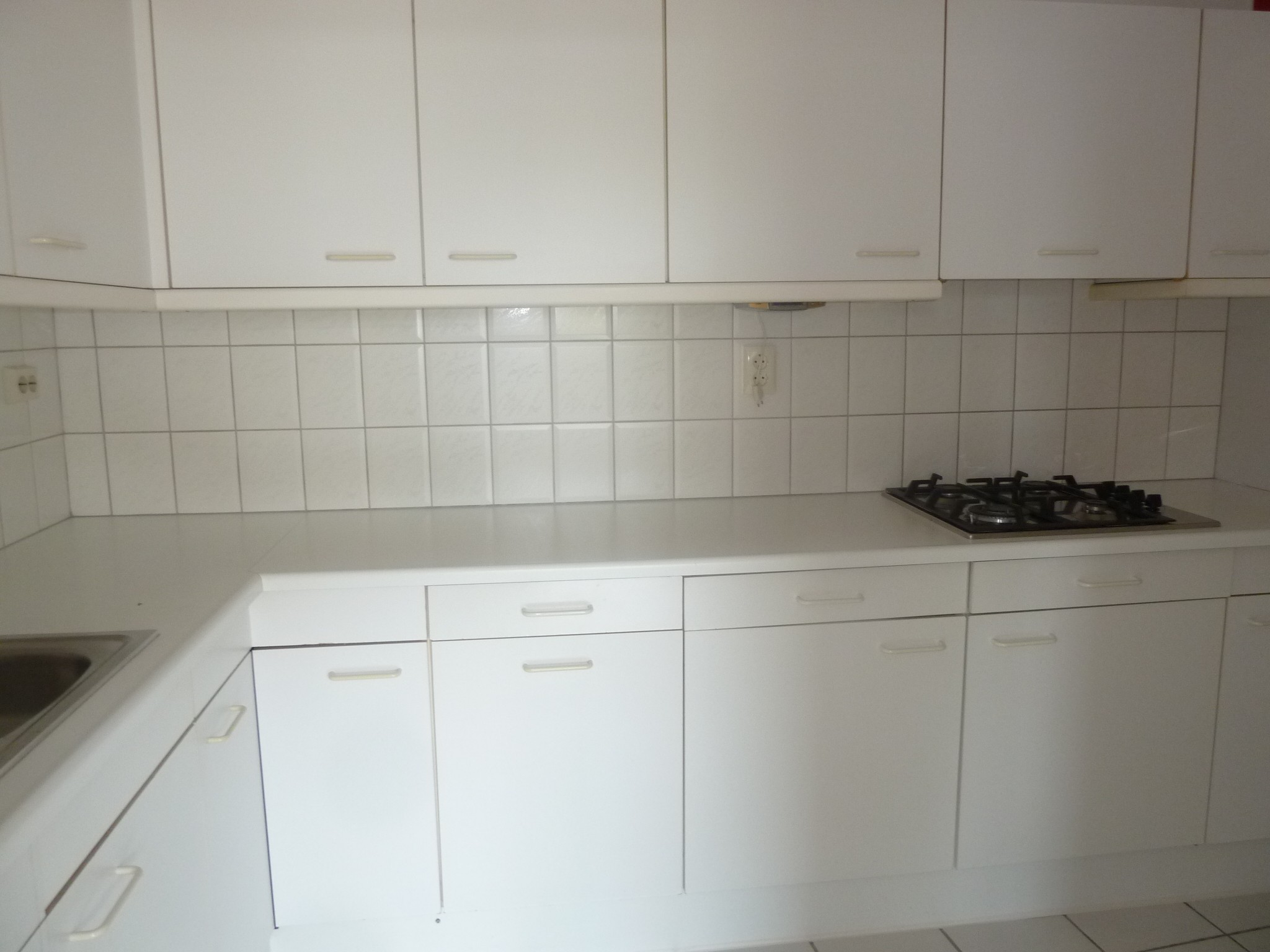 Open keuken met tegelvloer ca. 4.00 x 1.95 aanbouwkeuken v.v. gascomfort, afzuigkap, koelkast en vaatwasser.