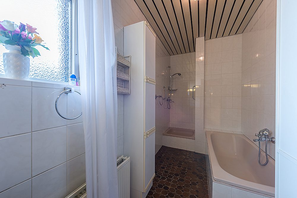 Badkamer met ligbad, douche en wastafel.