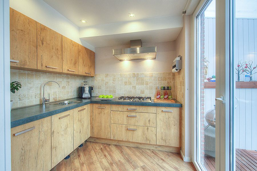 Open keuken ca. 2.40 x 2.12 met aanbouwkeuken v.v. 5-pits gascomfort, rvs afzuigkap, koelkast, vaatwasser en combi-magnetron.