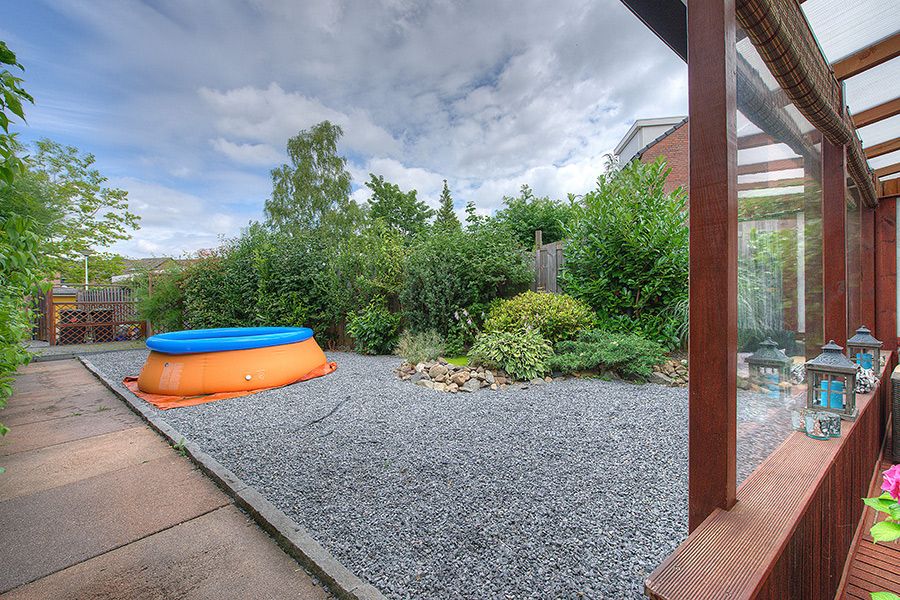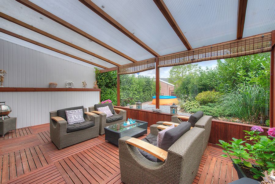 Overdekt zonneterras met aansluitend siertuin met gazon en achteruitgang.