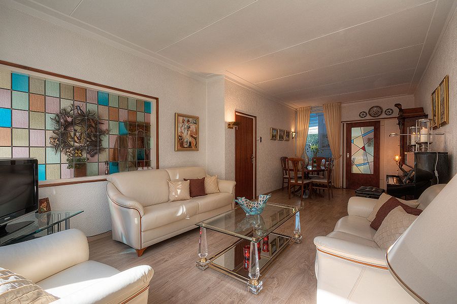 Woonkamer ca. 8.10×3.15/3.60 met laminaatvloer.