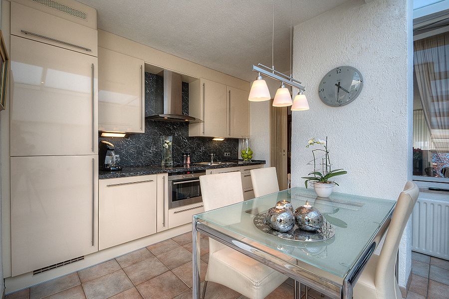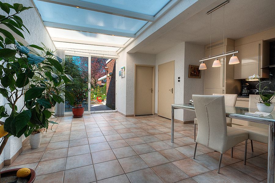 Leefkeuken met grote serre en tegelvloer ca. 6.00×5.40 De keuken met moderne vanille aanbouwkeuken is voorzien van keramische kookplaat, oven, afzuigkap, koelkast, diepvries en vaatwasser. Middels schuifpui toegang tot de tuin.