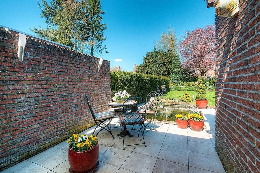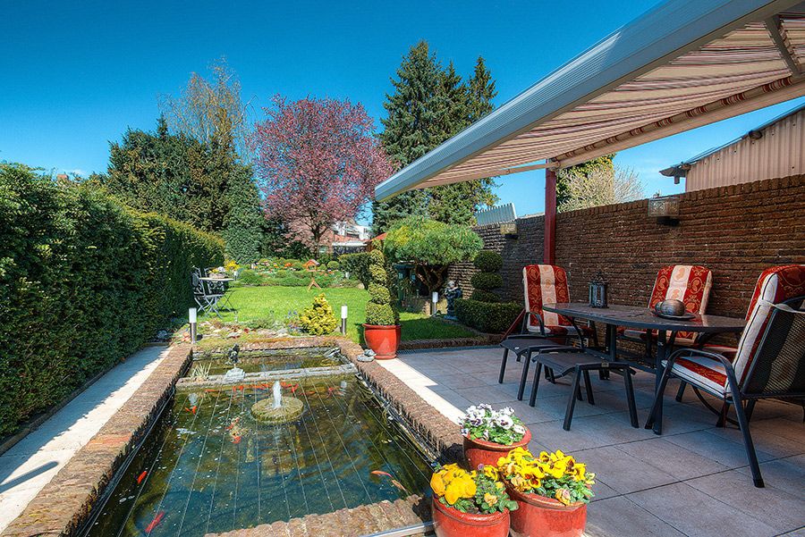 Omsloten siertuin met terras met zonnescherm, vijverpartij en optimale privacy.