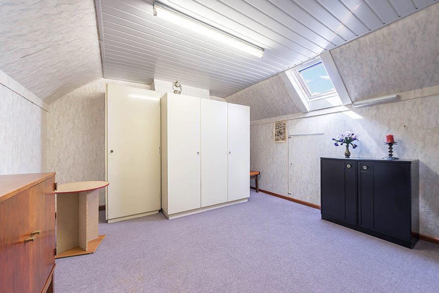 Vaste trap naar een overloop, vierde slaapkamer ca. 3.88×3.60 met bergkasten onder de kap.