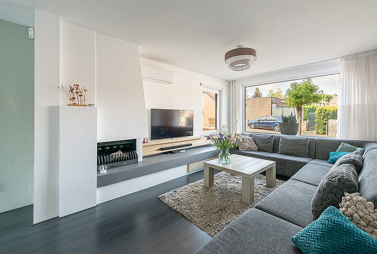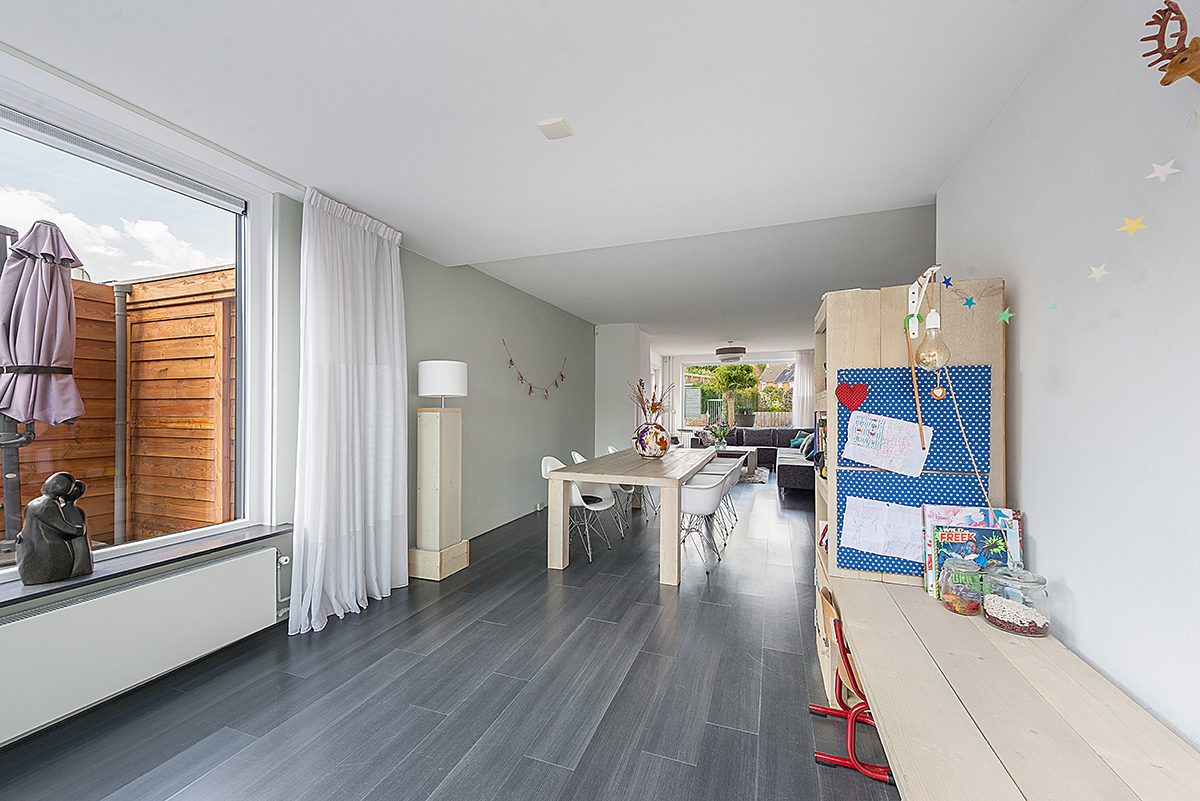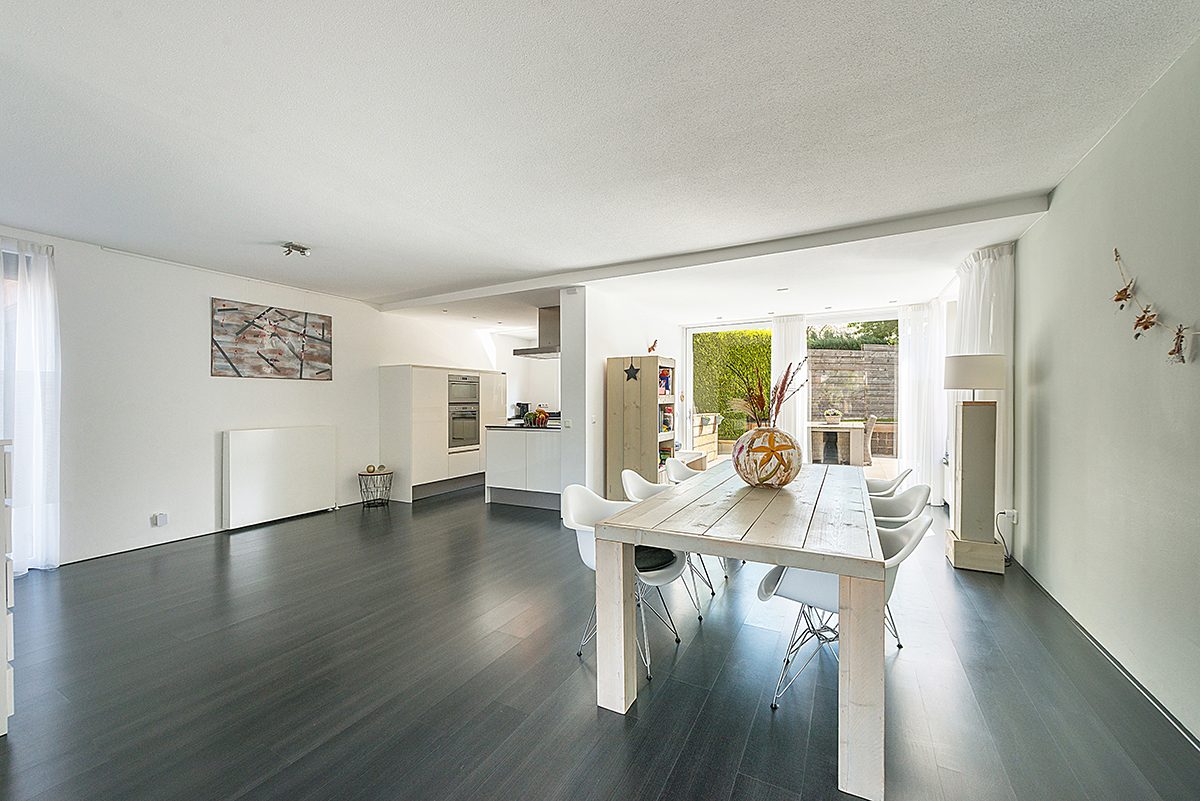 Riante living ca. 12.00 x 6.25/3.65 m met laminaatvloer, sierschouw, airco en schuifpui naar de tuin.