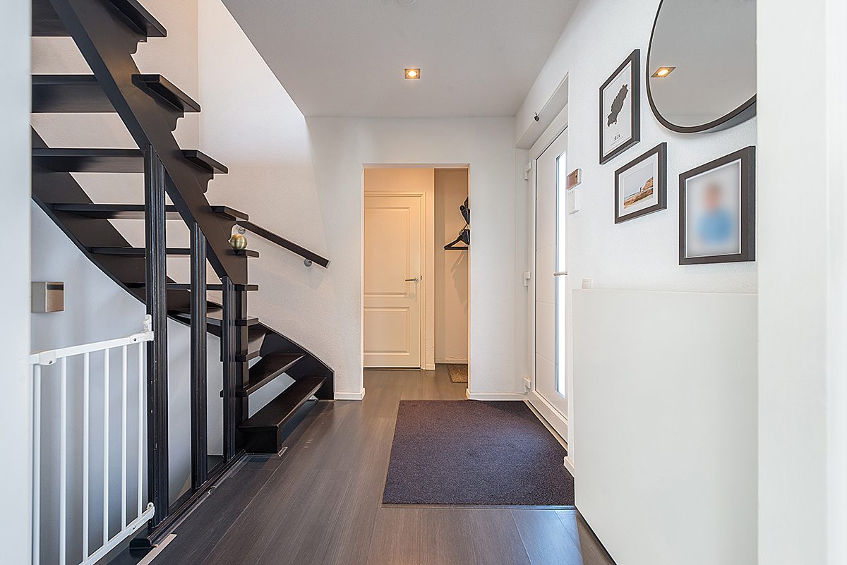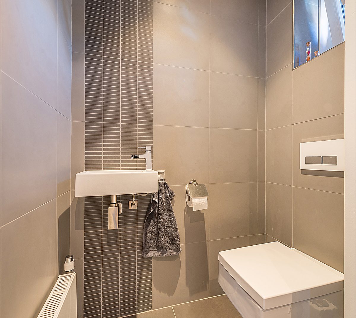 Entree/hal met laminaatvloer, modern gastentoilet met hangtoilet en fonteintje, garderobehoek en trap naar de verdieping.