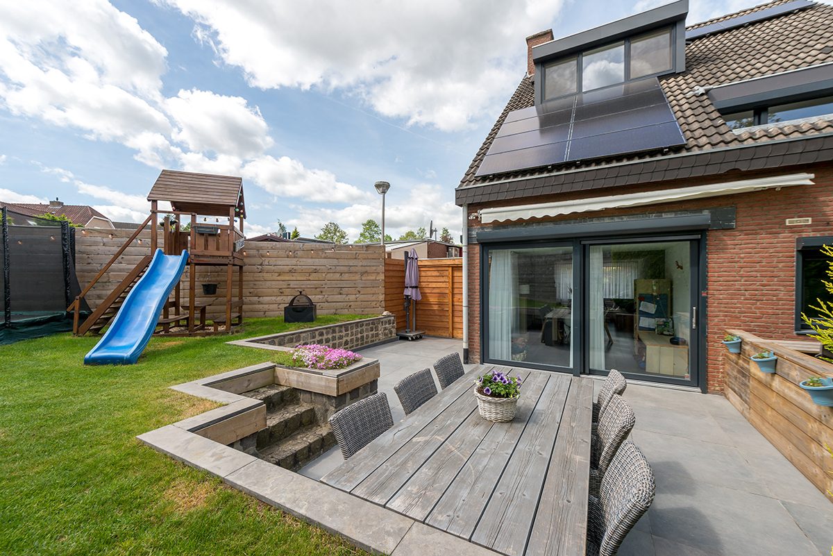 Recentelijk zeer fraai aangelegde siertuin met vernieuwde bestrating, gazon. Optimale privacy en goede bezonning. Moderne buitenkeuken.