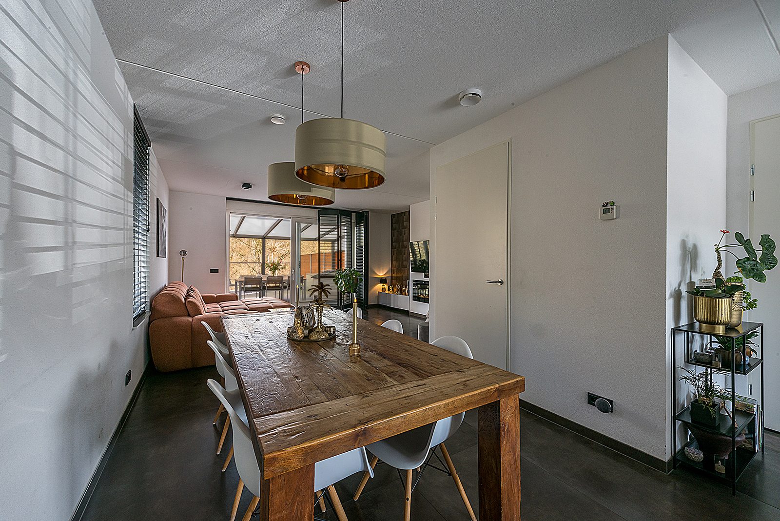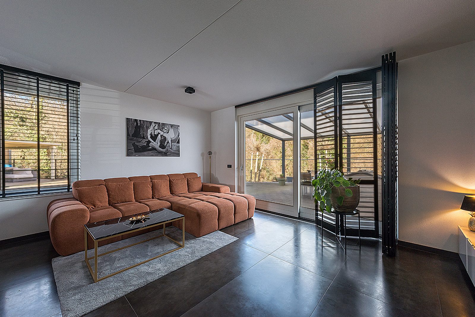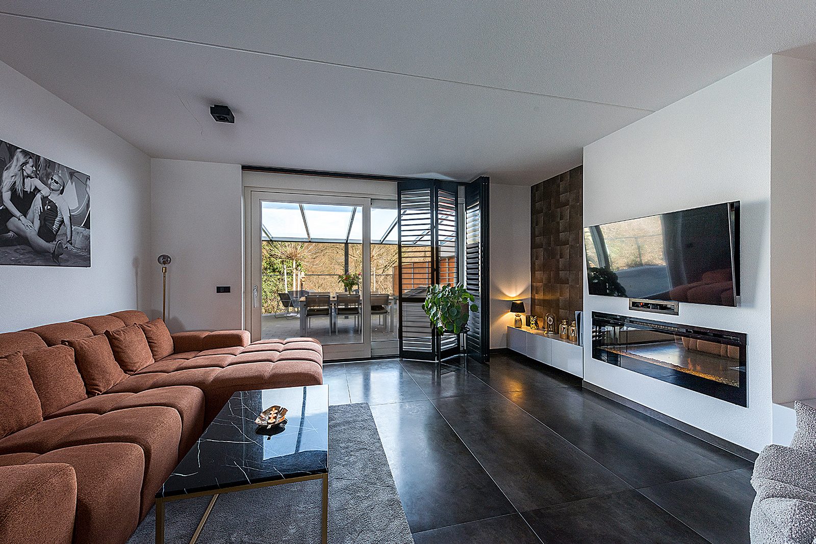 De sfeervolle elektrische haard, shutters en de schuifpui naar de tuin zorgen voor een warme en luxe uitstraling.