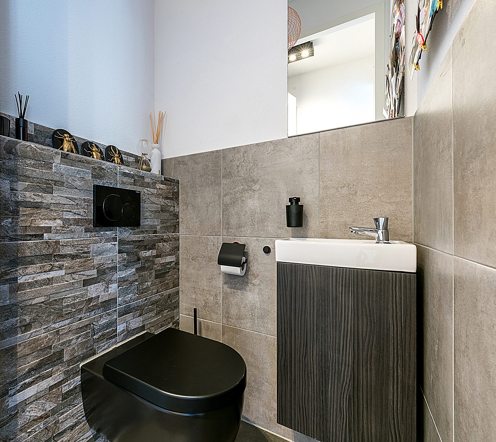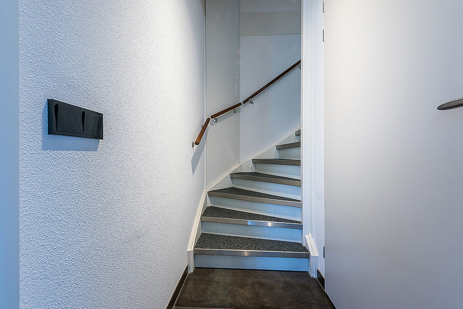 Tussenportaal met modern gastentoilet (voorzien van fonteintje) en trap naar de verdieping.