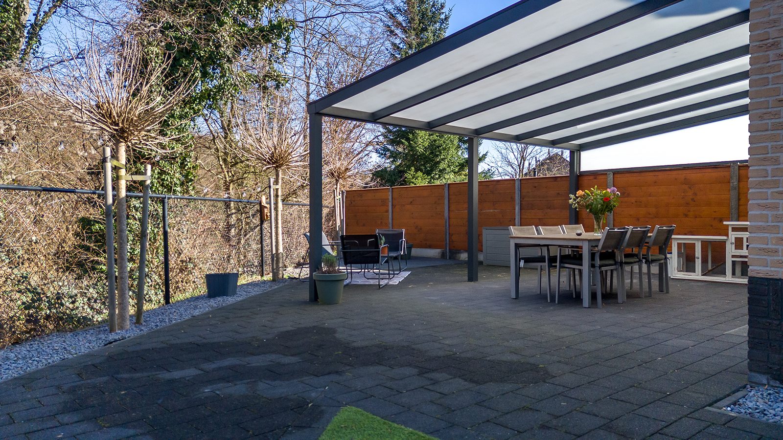 Vanuit de woonkamer bereikt u het grote overdekte zonneterras.