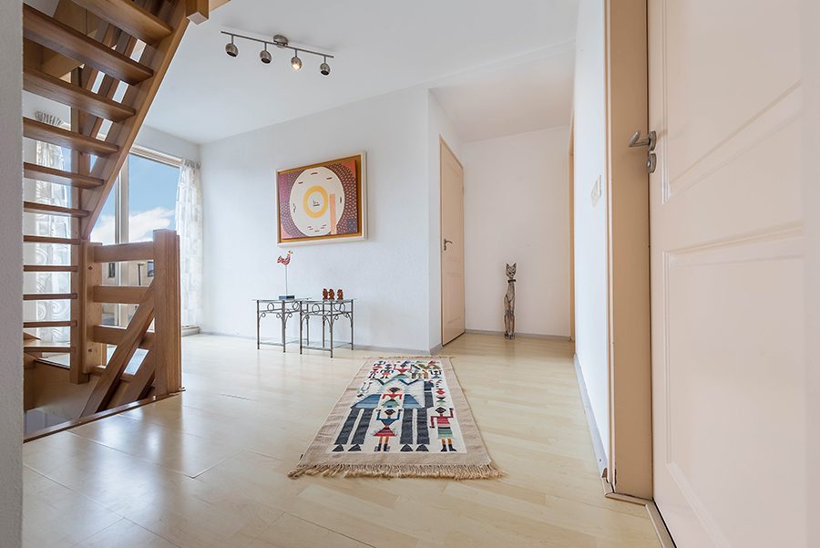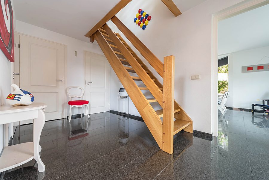 Entrée/hal met granieten vloer, meterkast, gastentoilet, garderobe en inpandige doorgang naar de ruime garage met electrische