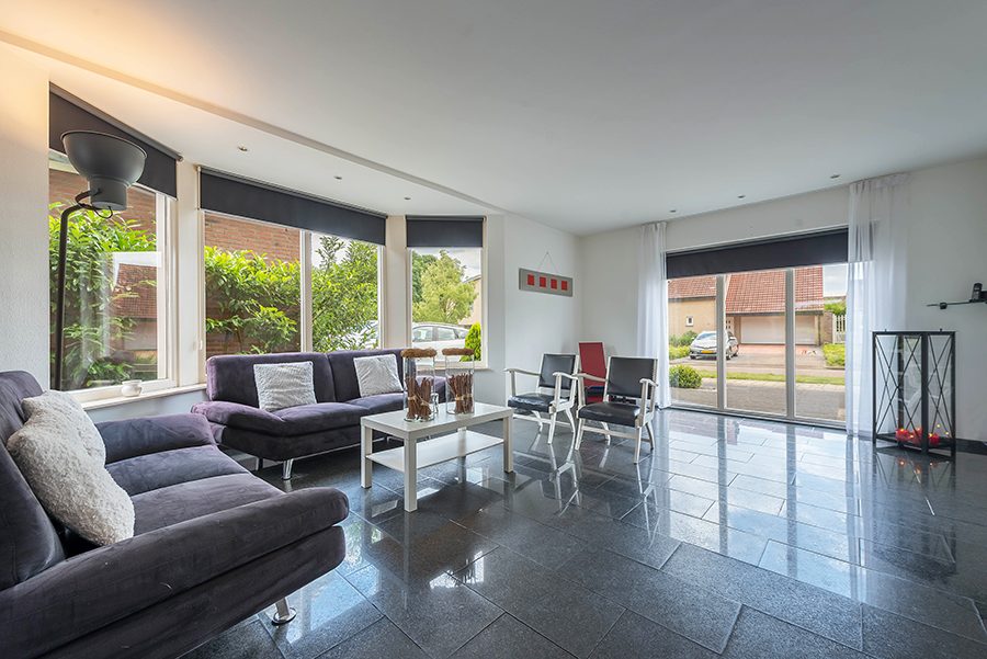 Glazen deur naar riante L- living ca 11.00 x 6.50/4.00 met granieten vloer, gashaard en openslaande deuren naar het terras.