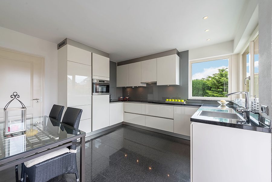 Het geheel is afgewerkt met een granieten werkblad. Toegang tot de tuin en het souterrain.