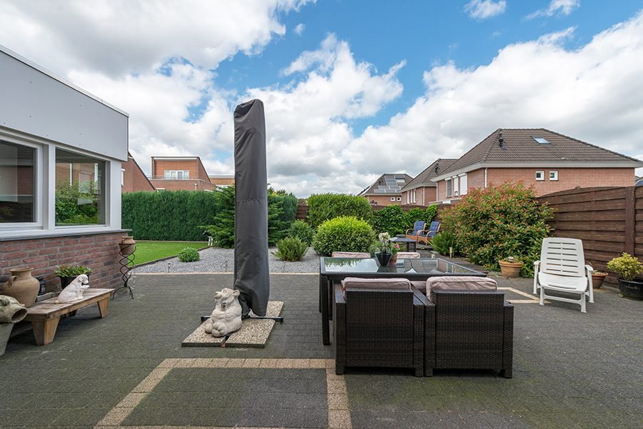 Omsloten en fraai aangelegde siertuin op Zuid-West gelegen met separate zij-ingang.