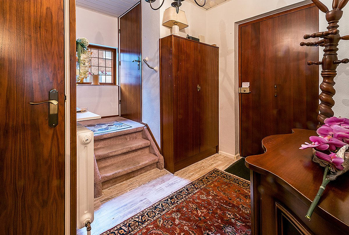 Entree/hal met laminaatvloer, meterkast en trap naar de verdieping.